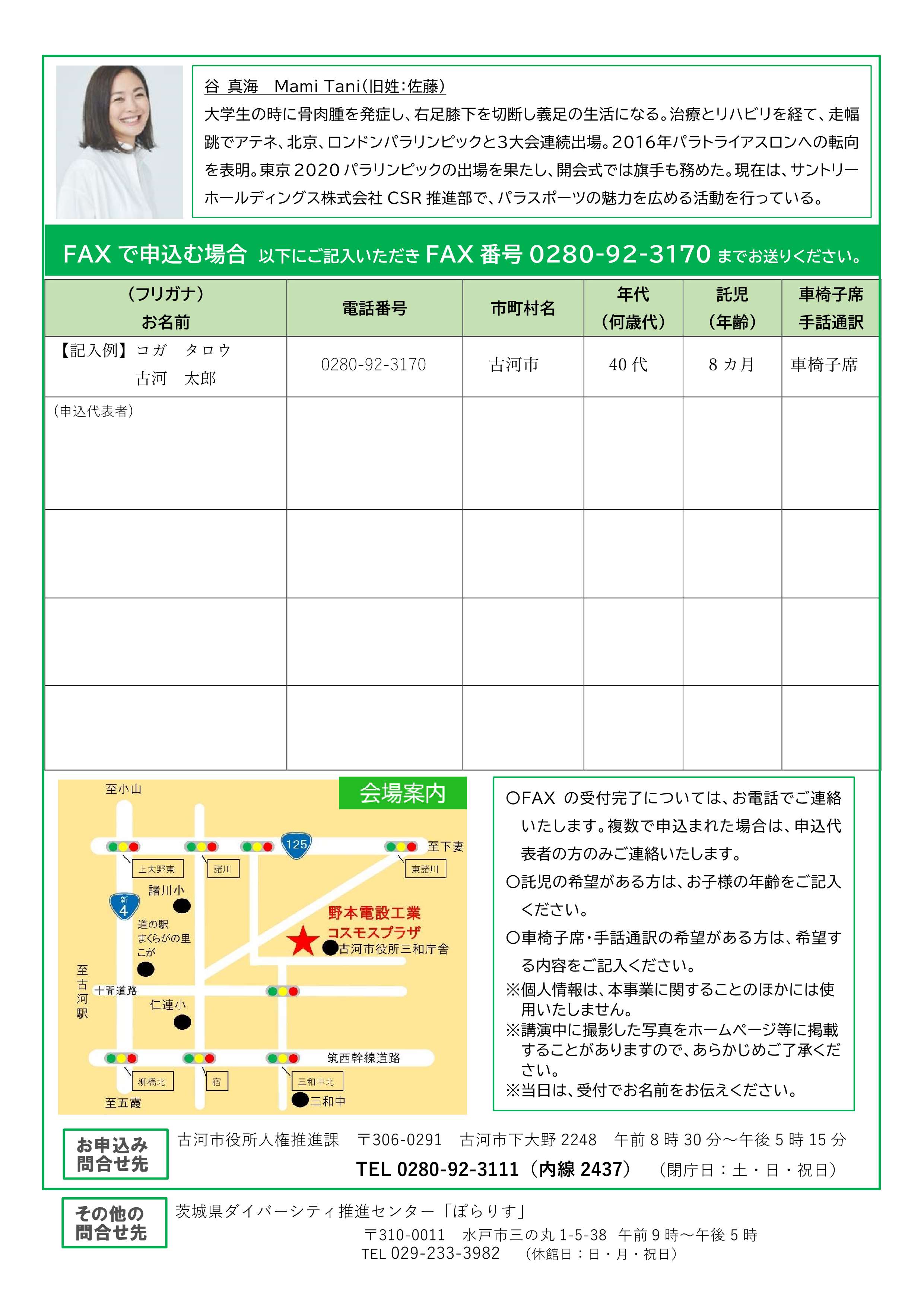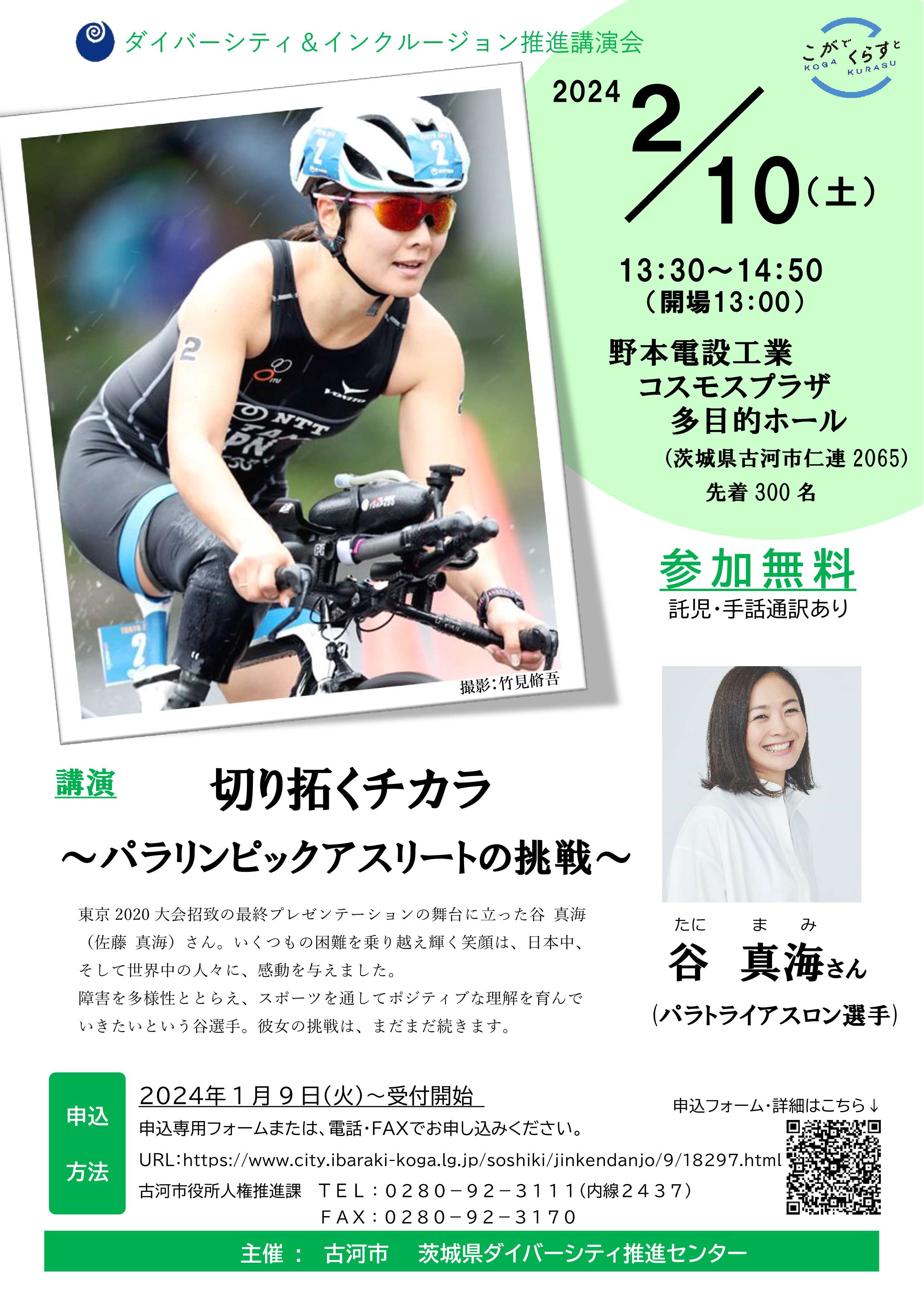 茨城県ダイバーシティ推進センターでは古河市と連携し、東京2020招致のプレゼンターとしてスピーチを行ったパラトライアスロン選手の「谷 真海さん」をお迎えして講演会を開催しました。