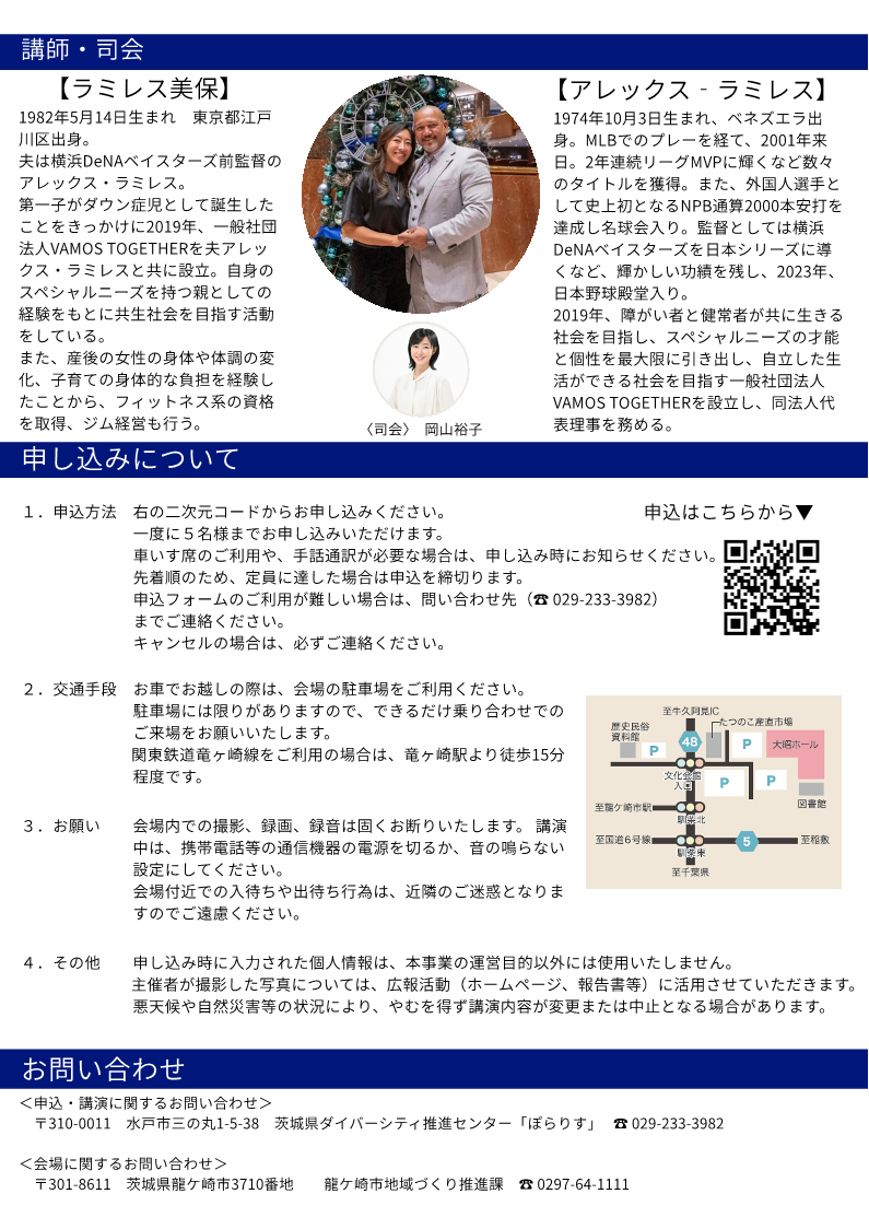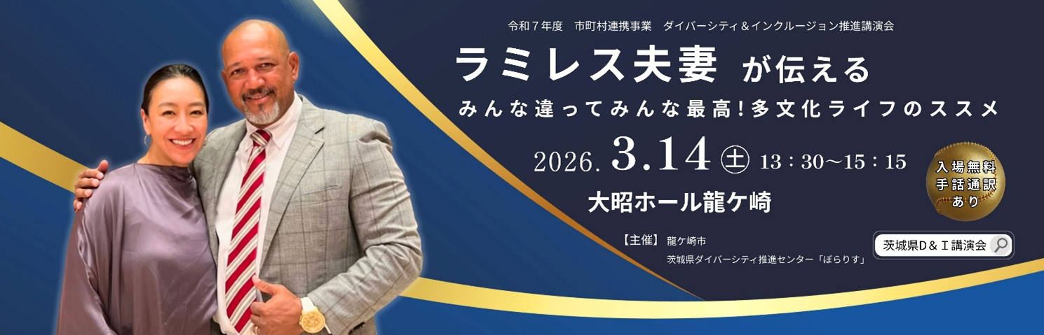 | ◆講演会に参加される皆様へ *事前に内容をご確認の上、ご参加ください。 ・会場内での撮影、録画、録音は固くお断りいたします。 講演中は、携帯電話等の通信機器の電源を切るか、音の鳴らない設定にしてください。 ・会場付近での入待ちや出待ち行為は、近隣のご迷惑となりますのでご遠慮ください。 ・申し込み時に入力された個人情報は、本事業の運営目的以外には使用いたしません。 ・主催者が撮影した写真については、広報活動(ホームページ、報告書等)に活用させていただきます。 ・悪天候や自然災害等の状況により、やむを得ず講演内容が変更または中止となる場合があります。 ♦お問い合わせ <申込・講演に関するお問い合わせ> 〒310-0011 水戸市三の丸1-5-38 茨城県ダイバーシティ推進センター「ぽらりす」 TEL:029-233-3982 <会場に関するお問い合わせ> 〒301-8611 茨城県龍ケ崎市3710番地 龍ケ崎市地域づくり推進課 TEL:0297-64-1111 |