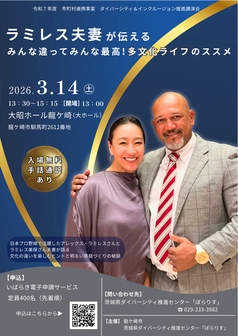 テーマ:ラミレス夫妻が伝える~みんな違ってみんな最高!多文化ライフのススメ~講 師:アレックス・ラミレス 氏 ラミレス美保 氏 |