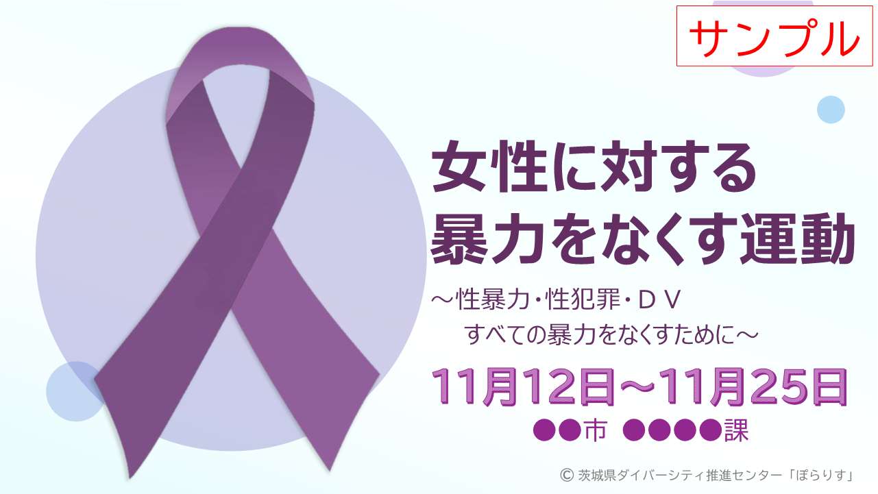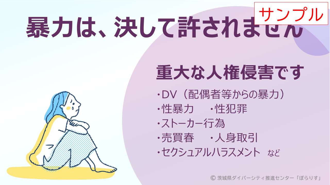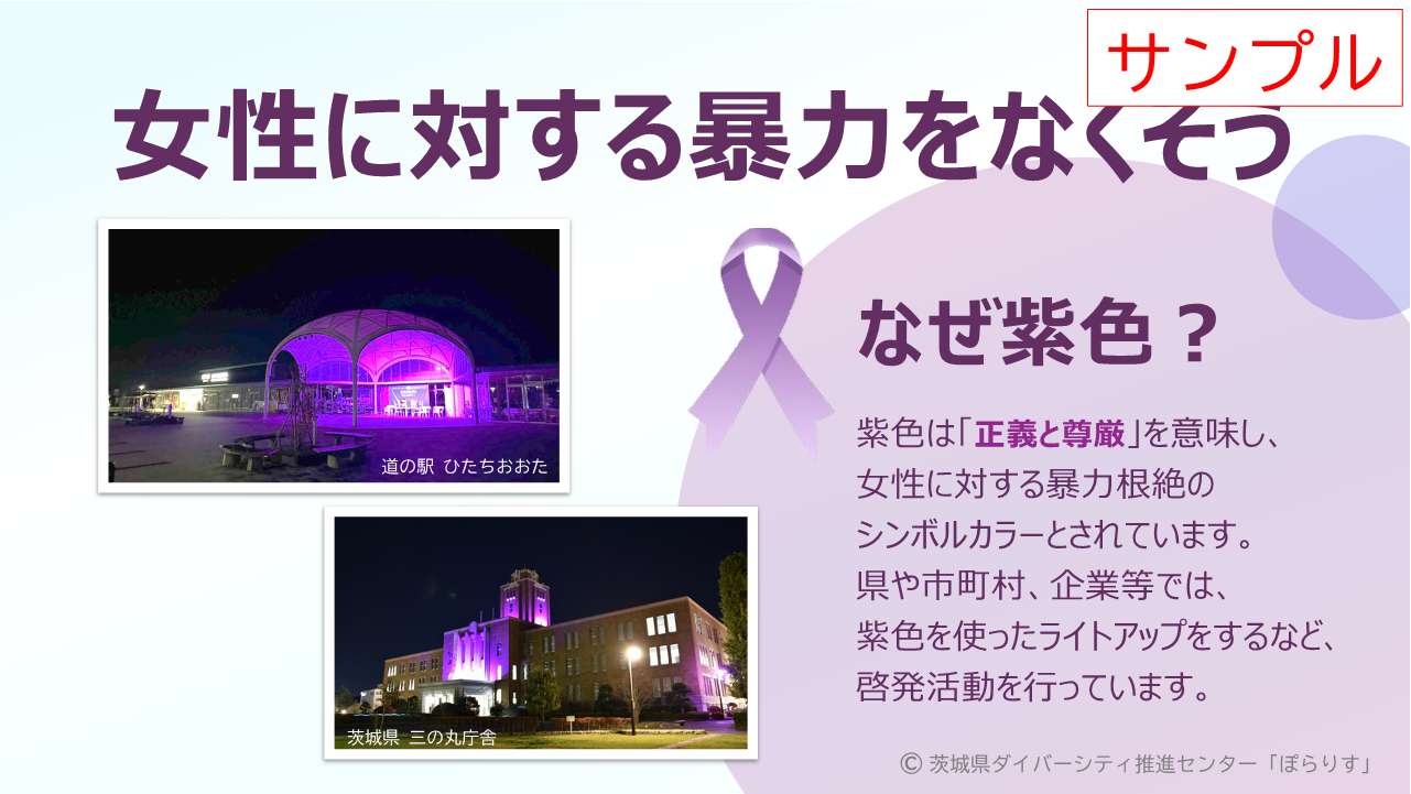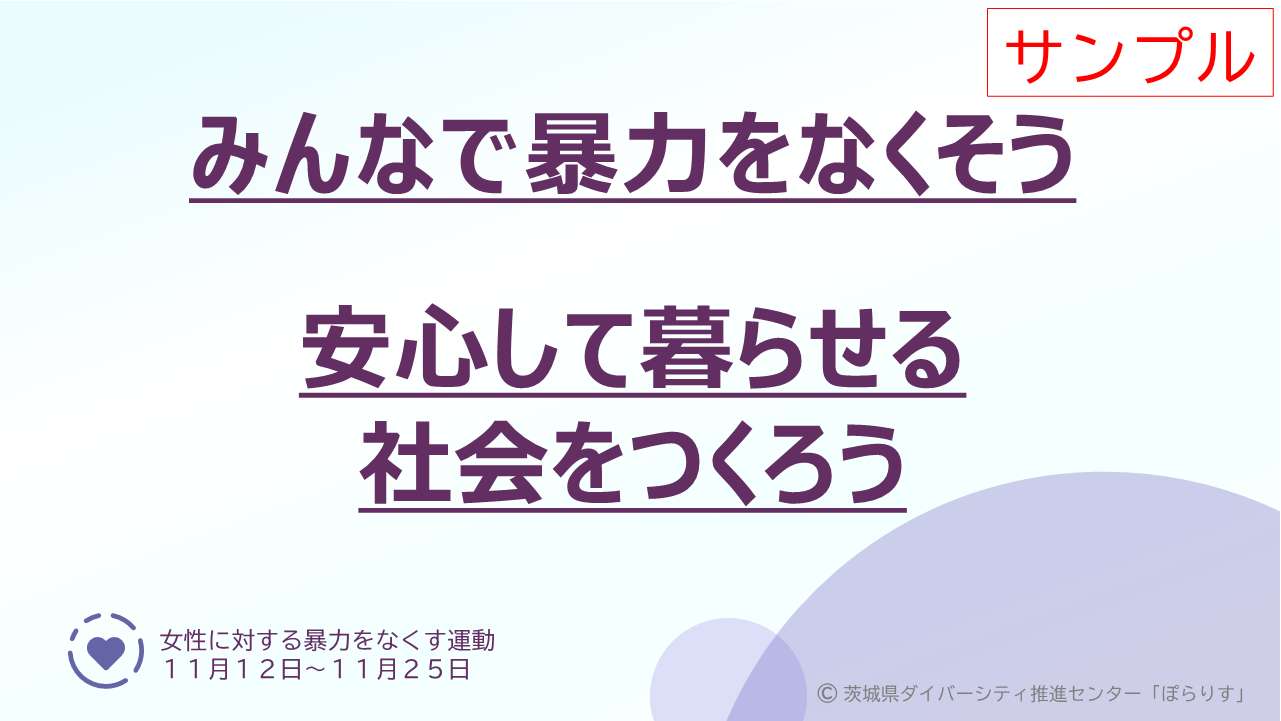 女性に対する暴力根絶を啓発するスライド資料(全10枚)です。掲示やデジタルサイネージ等でお使いいただけます。