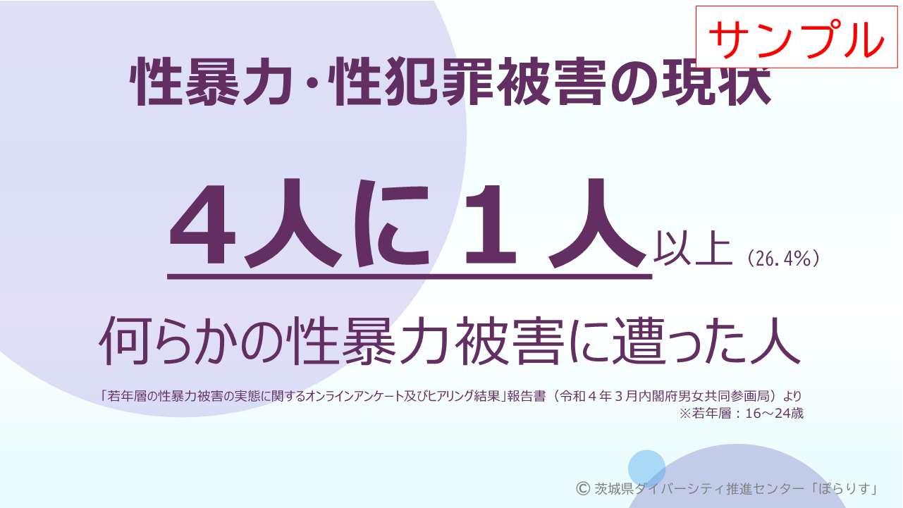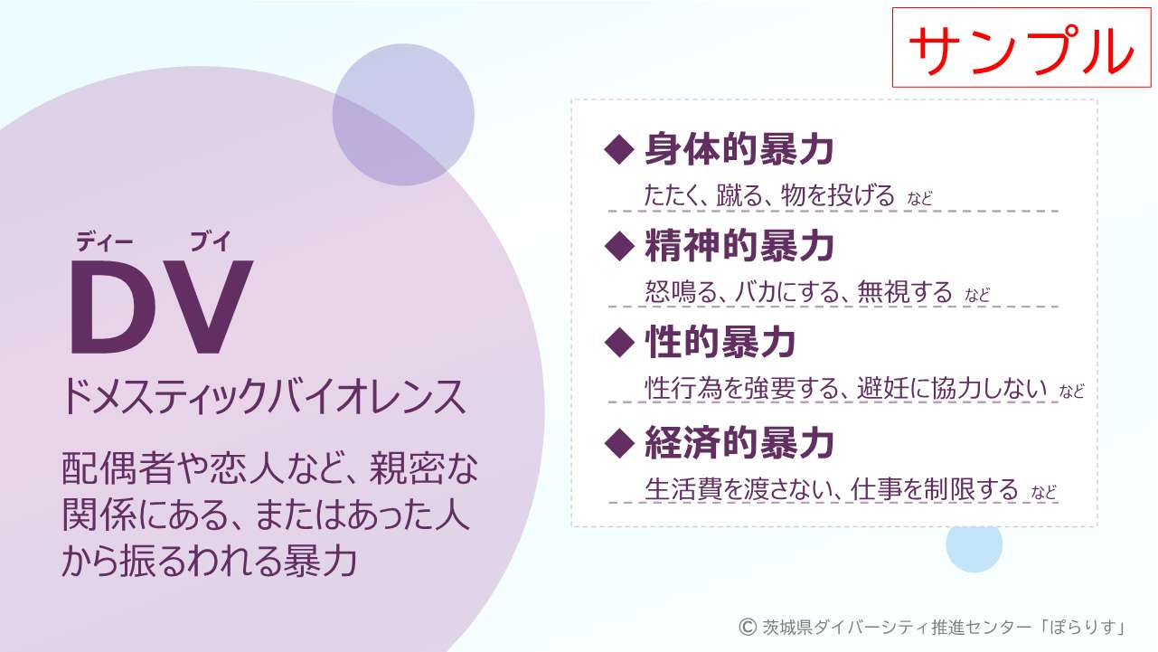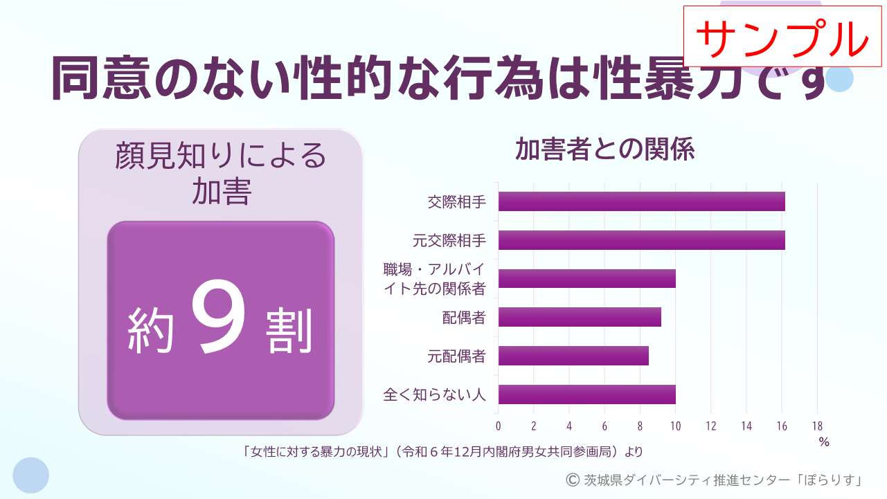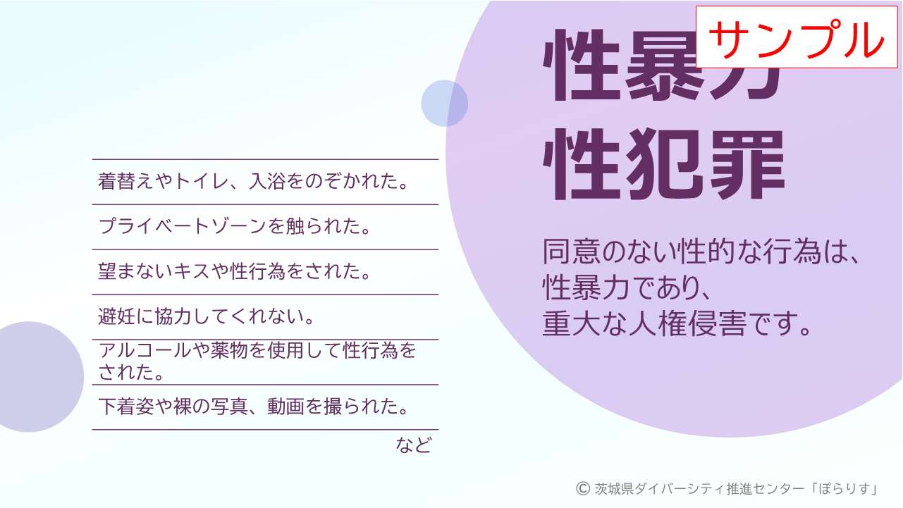 女性に対する暴力根絶を啓発するスライド資料(全10枚)です。掲示やデジタルサイネージ等でお使いいただけます。