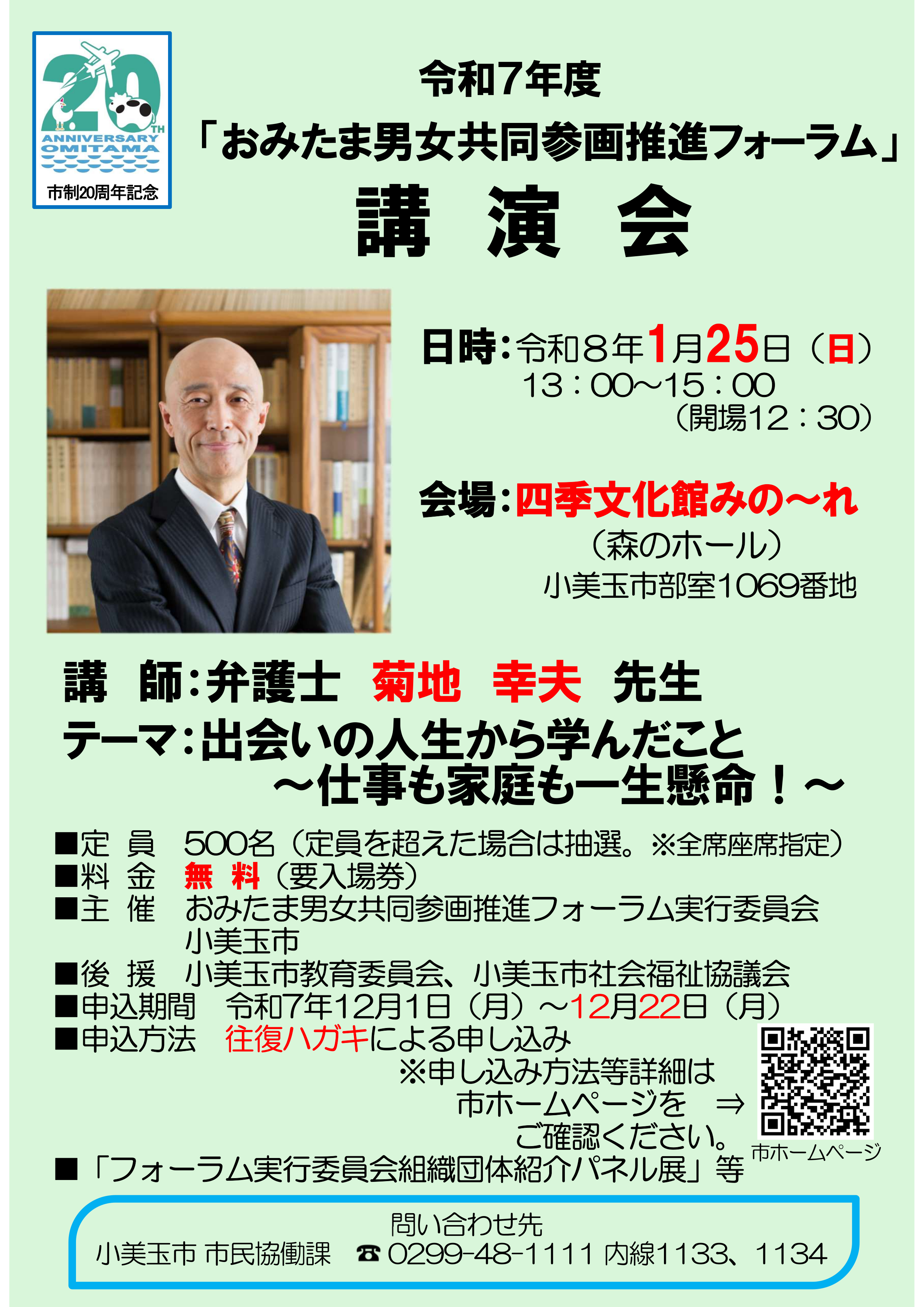差別や偏見のない、誰もがいきいきと輝きながら暮らせる男女共同参画社会の実現を目指して、今年度の「おみたま男女共同参画推進フォーラム」では、テレビでもお馴染みの菊地幸夫弁護士をお迎えし、「出会いの人生から学んだこと ~仕事も家庭も一生懸命!~」と題して、講演会を開催いたします。 申し込みは、往復はがきによる申し込みが必要で、応募多数の場合には、抽選となります。 お誘いあわせのうえ、多くの方のご来場をお待ちしております。 ▼詳細は下記ホームページをご覧ください。 https://www.city.omitama.lg.jp/0000/info-0000011988-0.html |