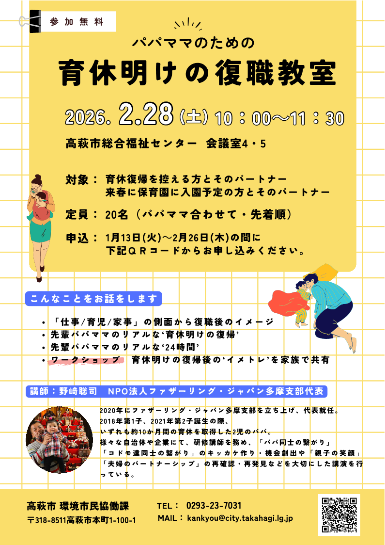 育休明けの復職に向けて家族で準備を始めませんか? 時短にする?保育園の送り迎えは誰が担当する?園から緊急連絡が来たらどう対応する? 「わが家」だからこそ、育休明けの復職後に向けてできることを家族で一緒に考える教室です。 日時:令和8年2月28日(土)10:00~11:30 場所:高萩市総合福祉センター 2階 会議室4・5 講師:野崎 聡司 NPO法人ファザーリング・ジャパン多摩支部代表 定員:20名 ▼詳細はこちら https://www.city.takahagi.ibaraki.jp/kurashi/news/page007951.html |